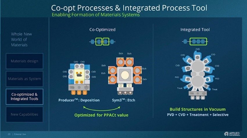 재료 시스템을 활성화하려면 단위 공정을 넘어 새로운 방식으로 역량을 발휘해야 한다. 어플라이드는 이를 솔루션이라 부르며 여기에는 두 가지 범주가 있다. 공동최적화(Co-optimized) 공정은 최상의 PPACt 값을 위해 인접한 단계 간 공정에 대한 상호작용을 최적화하는 것이다. 통합(Integrated) 장비는 웨이퍼를 공기에 노출시키지 않고 전 공정을 완전히 진공 상태에서 구축하는 것이다. 여기에서 다양한 기술이 동일한 툴에 적용된다.