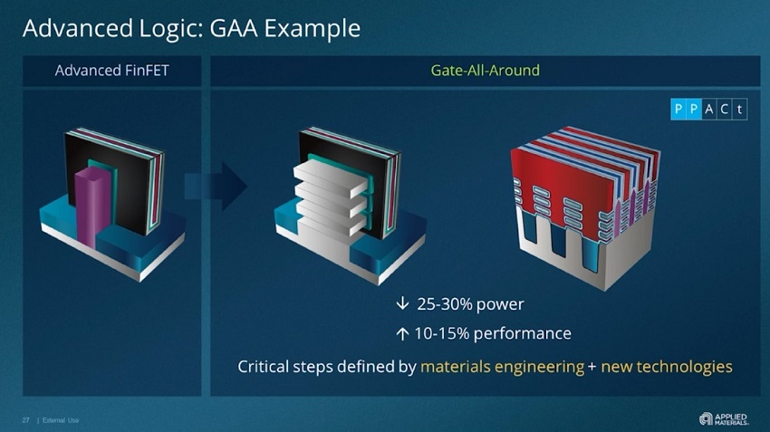 GAA 장치는 핀펫(FinFET) 다음으로 트랜지스터 구조의 주요 변곡점이다. 이는 상당한 PPACt 개선을 이끌며 최대 30% 더 낮은 전력, 최대 15% 더 빠른 속도를 제공한다.