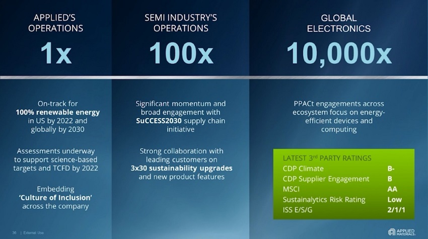 2020년 어플라이드는 새로운 10년 간의 지속가능성 로드맵을 발표했다. 어플라이드가 업계 미치는 영향을 설명하는 1x, 100x, 10,000x 프레임워크다. 1x는 어플라이드의 비즈니스 운영 방식, 100x는 고객과 공급업체를 포함한 업계에 미치는 영향, 10,000x는 PPACt 플레이북이 전 세계적으로 지속가능성을 주도할 수 있는 방법이다.