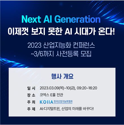 한국산업지능화협회(이하 ‘협회’)가 2023년 3월 9일(목)~10일(금) 서울 코엑스에서 산업지능화 생태계를 구축하고, 지속가능한 혁신성장을 가속화하기 위한 교류의 장인 ‘2023 산업지능화 컨퍼런스’를 개최한다.