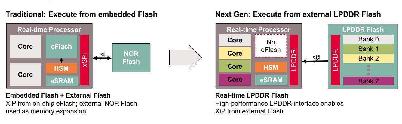 이로 인해 새로운 도전과제가 발생하고 있으며, 자동차 E/E(전기/전자) 아키텍처는 이러한 요구사항을 충족하기 위해 변화를 겪고 있다. 도메인(domain) 및 영역(zone) 컨트롤러는 많은 안전 필수 기능을 통합하고 많은 양의 데이터를 실시간으로 처리해야 한다. 임베디드 플래시가 없는 실시간 프로세서는 외장 플래시와 동등한 성능이 필요하다. 그러나 표준 xSPI(eXpanded SPI) NOR 플래시는 실시간 XiP(eXecute-in-Place) 성능 요구사항을 충족하지 못한다.