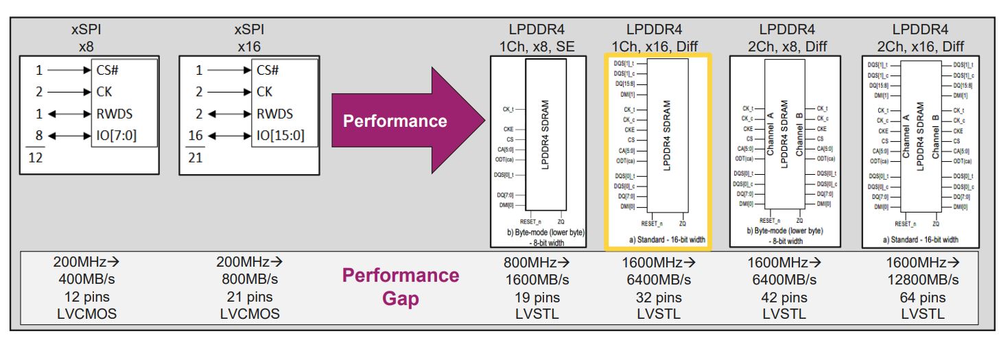LPDDR4 인터페이스는 외장 NVM 장치에서 직접 코드를 실행하는 데 필요한 확장성과 성능을 제공한다.