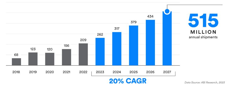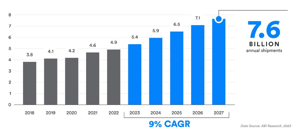 또한, 건강에 대한 인식이 높아지면서 웰니스 트래커(wellness trackers)와 같은 웨어러블 디바이스의 수요도 눈에 띄게 증가했다. 블루투스 기능이 지원되는 디바이스의 연간 출하량은 향후 5년 동안 연평균 9%의 성장률을 보이며 2027년까지 76억 대를 초과할 것으로 예상된다.