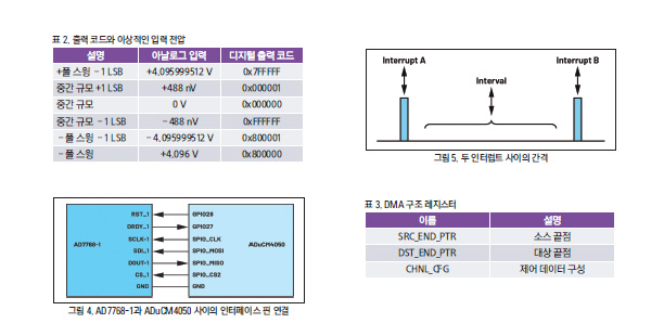 이 글에서 설명하는 사례의 경우에는 ADC의 24비트 출력 데이터를 지원하기 위해 SPI_CNT=4를 선택했다. SPI_DMA 레지스터는 SPI DMA 활성화다. SPI_DMA=0x5는 수신 DMA 요청을 활성화한다. pADI_DMA0 → EN_SET=(1<<5)는 다섯 번째 DMA 채널(SPI0 RX)의 DMA를 활성화한다.
