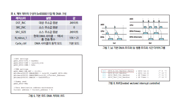DMA 처리를 위해서는 그 전에 먼저 몇 가지 SPI 및 DMA 설정이 필요하다(그림 6의 예제 코드 참조). SPI_CTL은 SPI 구성이다. ADI SPI 드라이버에 설정된 값으로부터 SPI_CTL=0x280f를 도출할 수 있다. SPI_CNT는 전송 바이트 수이다. 매 DMA 처리에 16의 고정된 비트 수만 전송할 수 있으므로, SPI_CNT는 2의 배수여야 한다.