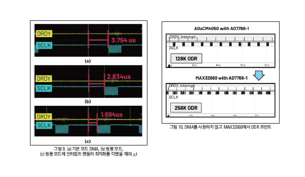 (a) 기법과 (b) 기법은 64kHz의 ODR이 가능한데, (c) 기법은 128kHz의 ODR이 가능하다. 이는 (c) 기법이 Δt가 가장 짧고, 그러므로 SCLK가 더 일찍 끝날 수 있기 때문이다. 만약 SCLK 신호, 다시 말해 데이터 처리가 T/2(T는 현재 ADC 출력 데이터 구간) 전에 이루어질 수 있다면, ODR을 배로 높이는 것이 가능하다. 이는 ADI SPI 드라이버의 8kHz ODR 속도 성능과 비교할 때 엄청난 진전이라고 할 수 있다.