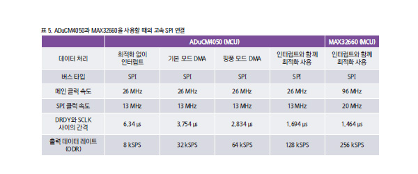 SPI를 통해서 ADC 출력 데이터를 인출하기 위해, 전력 소모가 적고 고속 성능이 가능한 MCU를 메인 디바이스로서 선택했다. 그런데 데이터 처리가 ADI SPI 드라이버를 기반으로 할 때, ADC 애플리케이션에 사용되지 않는 명령들 때문에 속도가 떨어질 수 있다.
