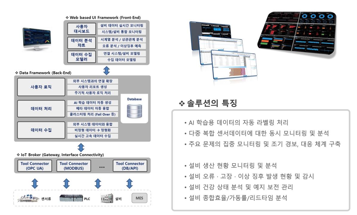 SFFA ADF : 설비/센서 데이터를 위한 데이터 프레임워크 솔루션으로, 설비/센서 데이터의 수집 계획 및 고속 처리 기능과 인공지능 학습 데이터를 실시간으로 자동 생성해주는 기능을 제공한다. 이들 솔루션은 제조 분야에서 공정 최적화, 고품질 제품 생산, 효율적인 설비 운영, 비용 절감 등의 이점을 제공하여, 중소기업들의 제조 지능화를 통한 디지털전환 및 제조혁신을 돕게 된다.