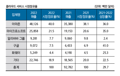 가트너(Gartner)는 2021년 928억 달러였던 매출액이 2022년에는 총 1,203억 달러로 증가했다고 발표했다. 아마존 이 여전히 시장 점유율 1위를 유지했고 마이크로소프트, 알리바바, 구글, 화웨이가 차례로 그 뒤를 이었다.