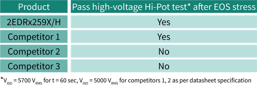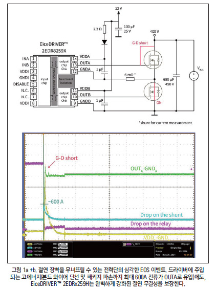 드라이버 출력과 접지 사이에 보호 다이오드가 없으면 상당한 양의 에너지가 벌크 커패시터(이 예에서는 680μF)에서 드라이버로 직접 전달되어 출력 칩 ChA의 전기적 고장과 본드 와이어 단선으로 인한 패키지 파손으로 이어진다. EiceDRIVER™ 2EDRx259X는 1차 측 칩에 구축된 견고한 절연으로 높은 전기적 과부하 후에도 완벽한 절연을 보장한다. 용량성(캐패시터를 이용한) 절연 기술을 사용하는 경쟁제품 2 및 3은 EOS 스트레스 후 하이팟 테스트에 통과하지 못했다.