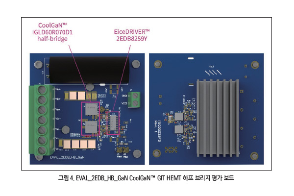EVAL_2EDB_HB_GaN 평가 보드(그림 4)는 EiceDRIVER™ 2EDB8259Y 듀얼 채널 절연 게이트 드라이버와 인피니언의 디스크리트 GaN HEMT를 결합한다. 이 보드는 여러 동작 모드와 다양한 구동 전원 방식(부트스트랩을 사용한 유니폴라 또는 바이폴라, 절연 또는 비절연)으로 테스트할 수 있다.