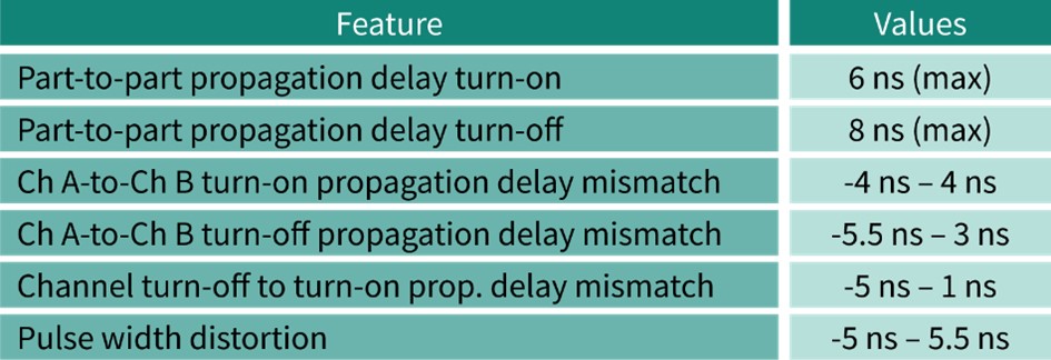 차세대 EiceDRIVER™ 2EDi는 WBG 디바이스를 사용하는 고속 스위칭 애플리케이션의 요구를 충족하는 기능을 포함한다. 뛰어난 전파 지연 정합 및 데드타임 정확도(표 3 참조)는 게이트 신호의 완벽한 타이밍 동기화(대각선 주행 등)와 데드타임 최적화를 보장하므로 시스템 신뢰성과 효율 성능에서 많은 장점을 제공한다. 뿐만 아니라 중요한 2단계 안전 메커니즘으로 게이트 드라이버 IC에 내장된 구성 가능한 슛스루 보호(STP)와 데드타임 제어(DTC)가 있다.