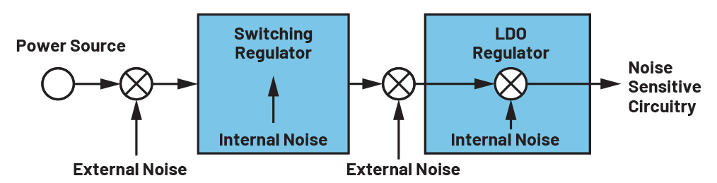 LDO 레귤레이터가 전원으로부터 다른 회로에 곧바로 연결되도록 사용되는 일은 거의 없다. 그렇게 하면 대부분의 경우에 전력 손실이 매우 클 것이다. 통상적으로 설계 엔지니어들은 전원 다음에 AC-DC 또는 DC-DC 스위칭 레귤레이터를 사용한다. 배터리 전원이든 AC 전원이든 전원 장치가 스위칭 레귤레이터로 전력을 공급할 때, 여기에는 자체적인 잡음이 있을 수 있고, 케이블이나 PCB에서 방사나 그 밖에 다른 여파로 인해 외부 잡음이 유입될 수도 있다.