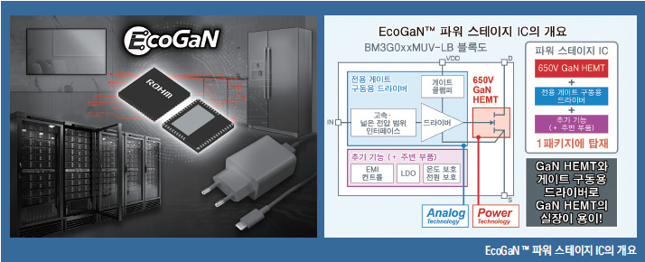 로옴은 이러한 시장 배경에 대응하여, 파워와 아날로그의 2가지 코어 기술을 융합함으로써 파워 반도체인 GaN HEMT와 아날로그 반도체인 게이트 구동용 드라이버를 1패키지에 집적한 파워 스테이지 IC를 개발했다. 이에 따라, 차세대 파워 반도체 GaN 디바이스의 실장이 용이해졌다.