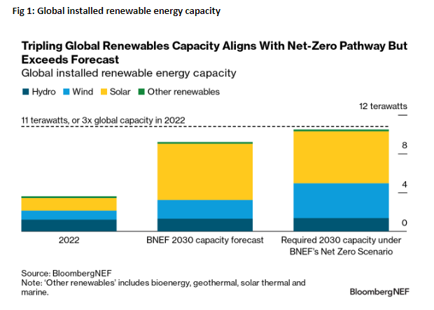 이는 2030년까지 재생 에너지 용량을 11테라와트로 확대하는 것으로, 블룸버그뉴에너지파이낸스(BNEF)의 최신 분석에 따르면 2050년까지의 글로벌 탄소중립 및 파리 기후 협약 목표에 부합한다.