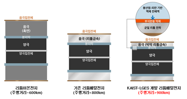 이 전해액은 충·방전 시 리튬메탈 음극 표면에 형성되는 수 나노미터 두께의 고체 전해질 층(Solid Electrolyte Interphase, SEI)을 치밀한 구조로 재구성함으로써 전해액과 리튬메탈 음극 간의 부식 반응을 차단하는 역할을 한다. 이를 통해 리튬메탈전지의 충·방전 효율을 향상시키는 것은 물론 1회 충전에 900km 주행이 가능할 만큼 에너지밀도를 높일 수 있다. 기존 고성능 전기차에 적용되는 리튬이온전지의 주행거리 약 600km보다 50% 높은 수준이다. 이 밖에도 400회 이상 재충전이 가능할 만큼 수명 안정성 확보도 가능하다. 또한 이번 연구에서 구현된 리튬메탈전지는 전고체전지와는 달리 구동 시 높은 온도와 압력이 요구되지 않아 전기차의 주행거리를 높이기 위한 간소화된 전지 시스템 설계가 가능하다.