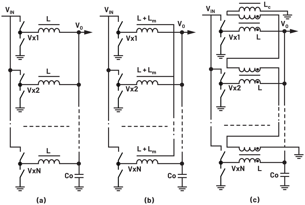 그림 1. (a) 디스크리트 인덕터(DL), (b) 결합 인덕터(CL), (c) TLVR을 사용한 다중 위상 벅 컨버터