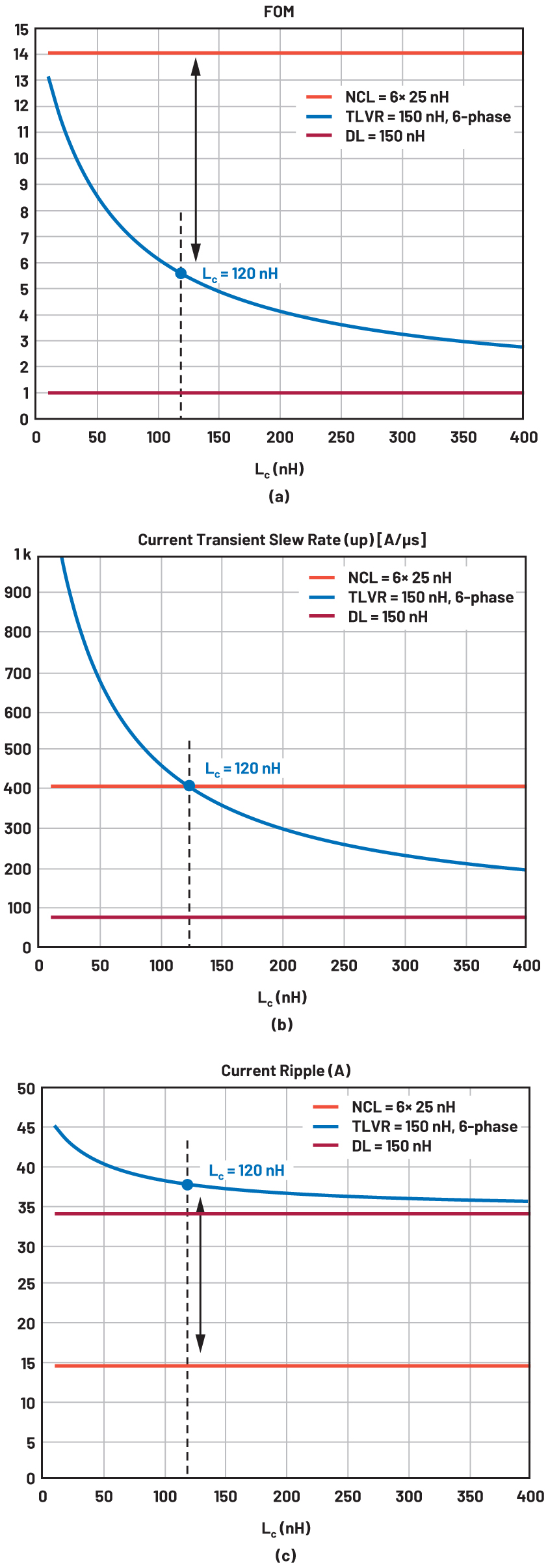 그림 3. Lc에 따른 TLVR의 절충. (a) FOM, (b) 전류 슬루율(상승), (c) 전류 리플. 실제 설계 포인트 Lc = 120nH도 표시하고 있다. (12V 대 1.8V, 6위상, Fs = 300kHz)