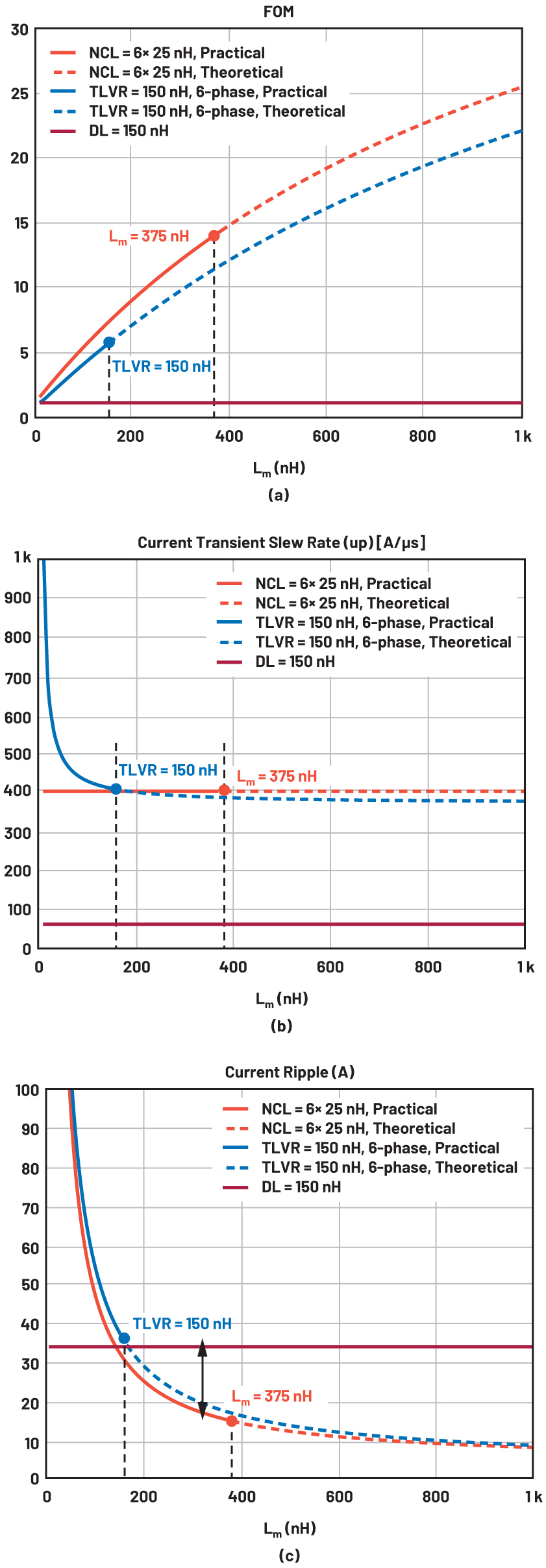 그림 4. TLVR 값(Lm) 대 TLVR 절충: (a) FOM, (b) 전류 슬루율(상승), (c) 전류 리플. Lc = 120nH로 주어진 크기에서 최대 값인 TLVR = 150nH 및 Lm = 375nH(NCL)를 표시하고 있다. (12V 대 1.8V, 6위상, Fs = 300kHz)