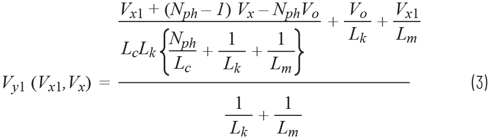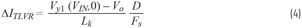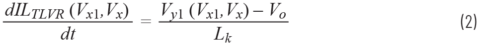 그림 2의 모델에 근거해서, TLVR의 전류 슬루율은 공식 2와 같이 나타낼 수 있다. 이 공식에서 Lk는 메인 권선과 보조 권선 사이의 TLVR 누설이다. Vx1 전압을 해당 위상에 대입하고 나머지 모든 Vx 노드는 동일한 전압인 것으로 간주한다(VIN 또는 0). 해당 노드 전압 Vy1은 공식 3에서 구할 수 있다. 공식 2를 사용해서 TLVR의 최대 트랜션트 슬루율을 바로 계산할 수 있다. Vx1 = Vx로 하고 이들 전압을 VIN(상승) 또는 0(하강)으로 지정한다.