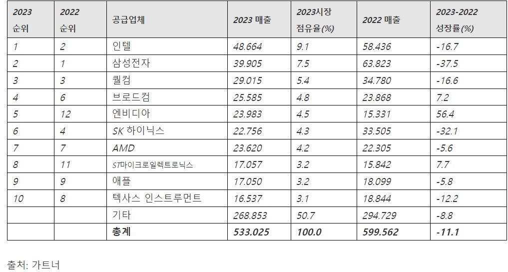 인텔의 1위 탈환과 엔비디아 진입, 이는 2023년 반도체 시장을 축약해 주는 말이다.