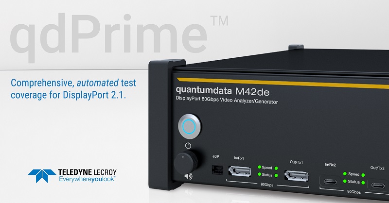 텔레다인르크로이의 퀀텀데이터 M42de 테스트 플랫폼은 이 디지털 디스플레이 인터페이스를 통합한 제품의 디스플레이포트 사양 준수 여부를 검증하는 데 사용할 수 있다. 이제 모든 검증 팀은 qdPrime 테스트 스위트를 통해 포괄적인 테스트 자동화가 가능해져 성능 테스트를 간소화하고 소스와 싱크 장치 간의 상호 운용성을 향상시킬 수 있다.