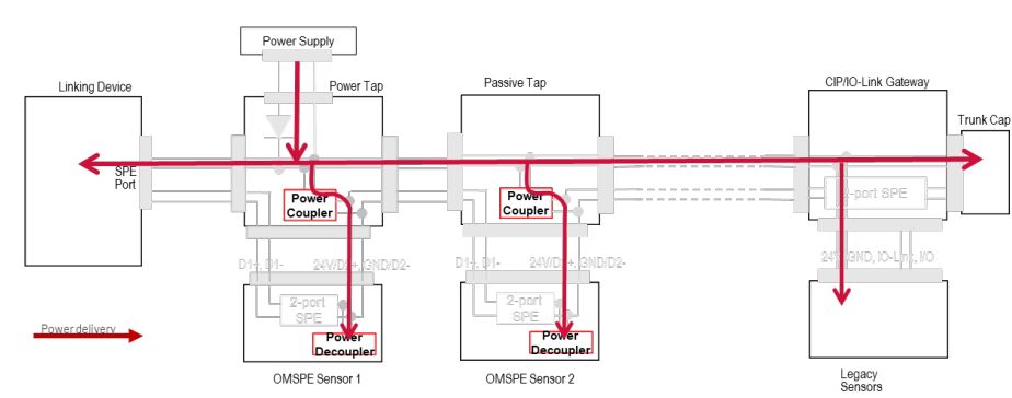 그림 7에서 볼 수 있듯이 OMSPE 센서 네트워크는 트렁크 미디어의 전원 쌍에 전원을 분배하고 전원 공급 SPE 개념을 통해 각 드롭에 전원을 전달한다. 전력공급 형 SPE 개념에는 패시브 탭의 전원 커플러와 OMSPE 센서의 전원 디 커플러가 필요하다. 패시브 탭의 전원 커플러는 트렁크 전원 쌍의 전원을 드롭 SPE 쌍에 연결한다. 전원은 전원 공급 형 SPE 쌍을 통해 OMSPE 센서에 전달된다. OMSPE 센서의 전력 분리는 SPE 쌍의 전력을 분리하고 OMSPE 센서 회로에 전력을 제공한다. 두 개의 인접한 OMSPE 센서는 이 드롭에서 동일한 SPE 쌍을 통해 통신한다.