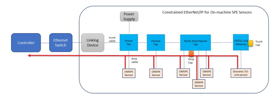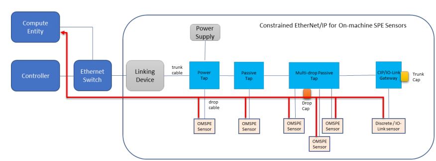 커뮤니케이션 관점: 각 OMSPE 센서에는 이중 SPE 포트가 있다. 첫 번째 SPE 포트 업스트림장치와 통신하고 두 번째 SPE 포트는 다음과 통신한다. 다운스트림 장치. 두 개의 OMSPE 센서 사이의 SPE링크 세그먼트는 다음과 같이 구성될 수 있다. 즉, 트렁크 미디어 1개, 트렁크 탭 2개, 드롭 미디어 2개로 구성된다. 사이의 SPE 링크 세그먼트 첫 번째 OMSPE 센서와 연결 장치는 하나의 트렁크 미디어, 하나의 드롭으로 구성된다.