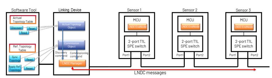EtherNet/IP캐비닛 내 사용 프로파일은 10 BASE-T1S 다중드롭 EtherNet/IP네트워크에 대한 네트워크 토폴로지 검색 및 시운전 프로토콜을 이미 지정했다. 캐비닛 내 실제 토폴로지 객체(현재 네트워크 토폴로지, 마지막으로 발견된 토폴로지의 변경사항 감지)와 인 커미션 객체(참조 토폴로지 동기화, 디바이스에 대한 IP주소 할당, 토폴로지 변경감지)의 주요 개념이 OMSPE 센서 네트워크에 재사용 된다. 그림 11과 같이 OMSPE센서 네트워크에는 소프트웨어 도구, CIP 객체, LNDC 관리자 및 LNDC End Node의 4가지 기본 LNDC엔티티가 있다.