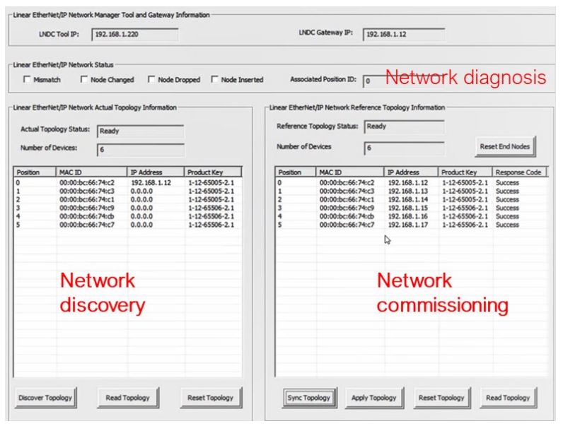 이 과정에서 IP 주소가 장치에 위임된다. 사용자는 "재설정" 또는 "읽기" 버튼을 클릭하여 참조네트워크 토폴로지를 재설정하거나 검색할 수도 있다. 작업 중에 LNDC 관리자는 네트워크 변경을 주기적으로 모니터링 하거나 감지할 수 있다. 네트워크 진단정보(네트워크 불일치, 노드 변경, 노드 삽입, 노드 제거 및 관련 위치 ID)가 네트워크진단 영역에 표시된다.