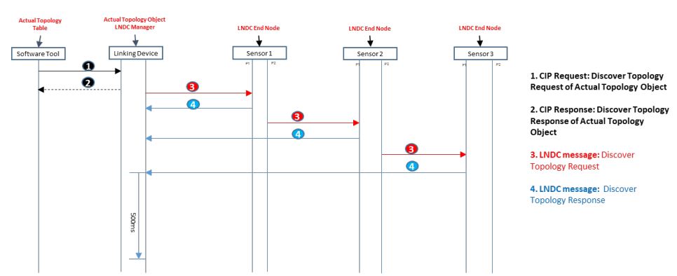 1. LNDC 소프트웨어 툴은 링킹 디바이스의 커미셔닝 객체에 CIP 싱크 토폴로지 요청을 보낸다. 커미셔닝 객체는 LNDC 소프트웨어 툴에 CIP Sync 토폴로지로 응답한다.