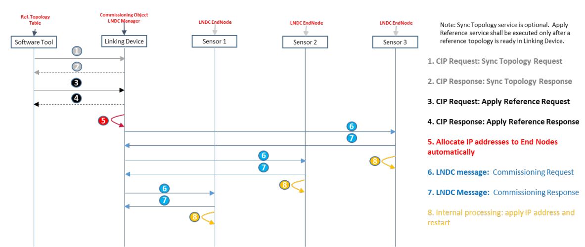 2. Commissioning 객체는 CIP Sync Topology 응답으로 LNDC 소프트웨어 도구에 응답하고 실제 토폴로지 객체에서 실제 토폴로지 정보를 검색하여 이를 참조 토폴로지로 설정한다. 커미셔닝 객체의 참조 토폴로지는 검색된 실제 토폴로지 대신 사용자구성에 의해 생성될 수 있다.