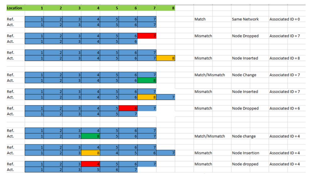 LNDC 관리자는 참조 토폴로지를 현재 실제 토폴로지와 비교하여 네트워크 변경(노드제거, 삽입, 변경)을 감지할 수 있다. 그림 14 LNDC - 네트워크 진단 시나리오. 참조 토폴로지와 실제 토폴로지를 비교하고 해당 네트워크의 진단 결과를 도출한다. 장치교체 사례(노드 변경)의 경우 키 일치 기준에 따라 기존장치의 제품 키와 새 장치의 제품 키를 비교하여 네트워크 일치/불일치를 보고한다. 사용자는 노드 제거, 삽입, 변경 위치를 쉽게 확인할 수 있다.