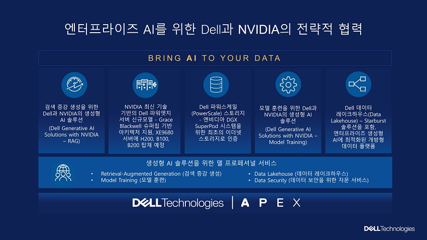신규 솔루션인 ‘델 AI 팩토리 위드 엔비디아(Dell AI Factory with NVIDIA)’를 비롯해 ‘델 생성형 AI 솔루션(Dell Generative AI Solutions)’ 포트폴리오를 확대하고, 기업과 기관들이 자체 보유한 데이터와 AI 툴, 그리고 온프레미스 인프라를 보다 안전하고 빠르게 통합하여 생성형 AI 투자 효과를 극대화하도록 돕는 것을 골자로 한다.