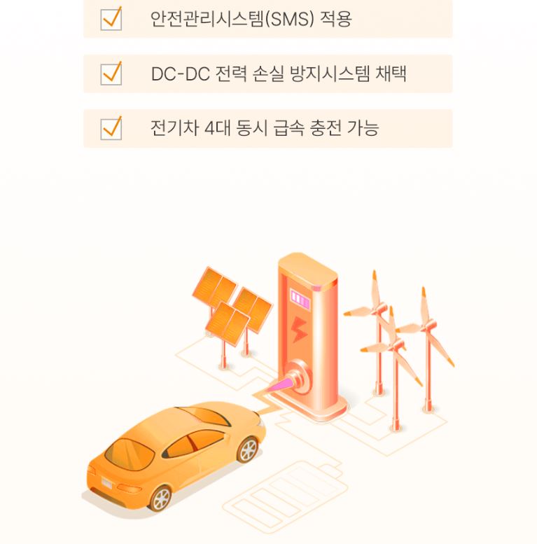 탄소중립, RE100의 영향으로 최근 가장 크게 관심받고 있는 제품은 EV B·PLUG입니다. 도심형 전기차 배터리 급속 충전 시스템으로 건물이 밀집된 구역 내 설치를 기본으로 하고 있습니다. 전기차가 증가하게 되면 신규 전력 개통 또는 증설이 어려운 지역은 결국 전력이 부족한 현상이 발생하게 됩니다. 이때 한국전력공사 계통 전력에 보조적으로 태양광 전력을 사용할 수 있으며 심야와 같이 전력 요금이 저렴하거나 충전량이 줄어들 때 미리 저장해두었다가 사용하는 형식입니다. 전력 부족뿐만 아니라 계속해서 오르고 있는 전력 요금까지 해결해줄 수 있습니다.