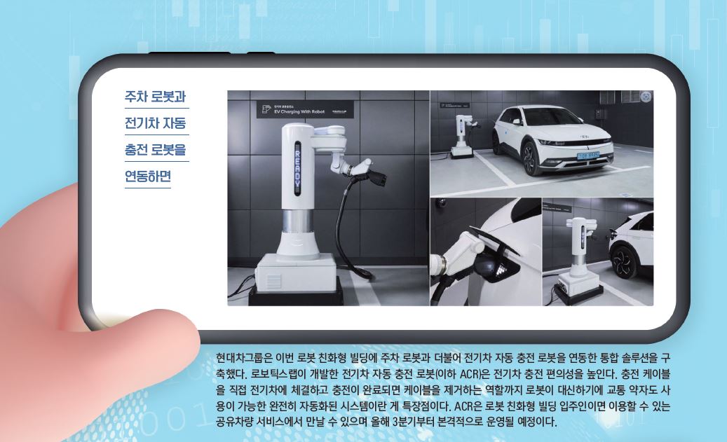 현대차그룹은 이번 로봇 친화형 빌딩에 주차 로봇과 더불어 전기차 자동 충전 로봇을 연동한 통합 솔루션을 구축했다. 로보틱스랩이 개발한 전기차 자동 충전 로봇(이하 ACR)은 전기차 충전 편의성을 높인다.