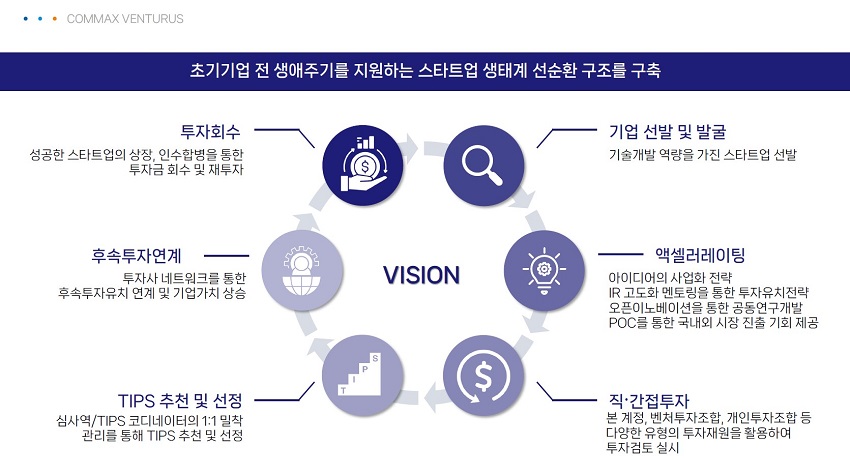 코맥스벤처러스는 2017년 4월 설립하여, 같은 해 7월에 중기부 산하 7기 TIPS 운영사로 선정되었다. 지금까지 약 30여개 스타트업에 투자 및 TIPS 추천 후 그들과 함께 성장을 도모하고 있는 기업이다.