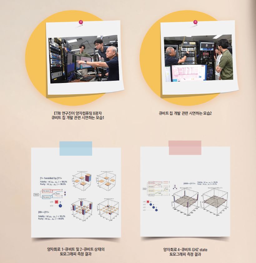 (위 왼쪽에서 시계 방향) ▲ETRI 연구진이 양자컴퓨팅 8광자 큐비트 칩 개발 관련 시연하는 모습, ▲큐비트 칩 개발 관련 시연하는 모습, ▲양자회로 4-큐비트 GHZ state 토모그래피 측정 결과 ▲양자회로 1-큐비트 및 2-큐비트 상태의 토모그래피 측정 결과