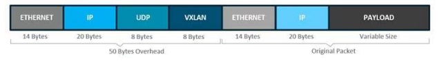 그림 5에서 볼 수 있듯이 VXLAN 캡슐화는 UDP 전송을 사용한다. 원본 패킷을 캡슐화하는 데 사용되는 VXLAN 및 UDP 헤더와 함께 외부 IP 및 이더넷 헤더가 필요하며, 패킷을 유선으로 전달하려면 외부 IP 및 이더넷 헤더가 필요하다. 이러한 추가 헤더는 최소 50바이트의 오버헤드를 원본 패킷에 추가한다.