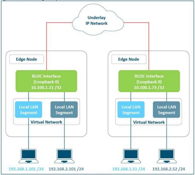 다음 다이어그램은 오버레이 네트워크의 일부인 두 개의 서브넷의 예를 보여준다. 물리적으로 분리된 레이어 3 디바이스, 즉 두 개의 에지 노드에 걸쳐 확장되는 서브넷이다. RLOC 인터페이스는 다음과 같다. 동일한 VN 내에서 동일하거나 다른 서브넷의 엔드포인트 간에 연결을 설정하는 데 필요한 유일한 언더레이 라우팅이 가능한 주소이다.