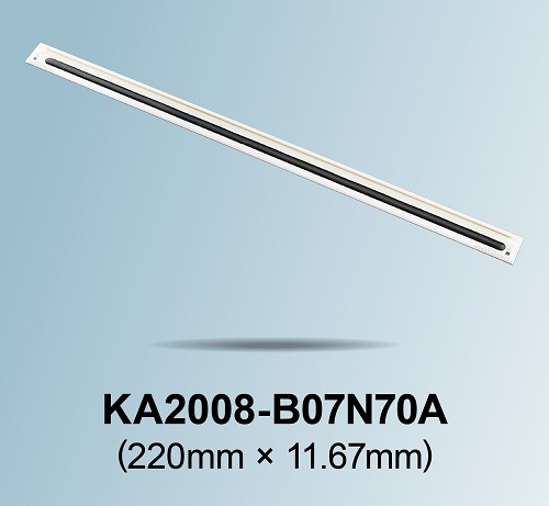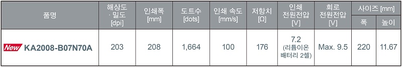 KA2008-B07N70A는 A4 사이즈(가로 폭 210mm)의 프린터에 대응하는 제품으로, 높이를 기존 제품의 14mm에서 업계 최소 수준인 11.67mm로 약 16% 소형화해 프린터 전체의 공간 절약화에도 기여한다. 특히, 발열체 구조를 최적화한 드라이버 IC 및 배선 레이아웃을 개선함으로써 7.2V 구동에 대응해 기존 12V 구동 대비, 인쇄를 위해 필요한 인가 에너지를 약 66% 저감했다(조건: 인쇄 속도 50mm/sec). 또한, 발열체의 개별 배선 조정을 통해 발열량을 균일화함으로써 인쇄 품질을 안정화시켜 최고 인쇄 속도 100mm/sec의 고속 인쇄 시에도 해상도 203dpi로 선명한 인쇄 화질을 실현했다.