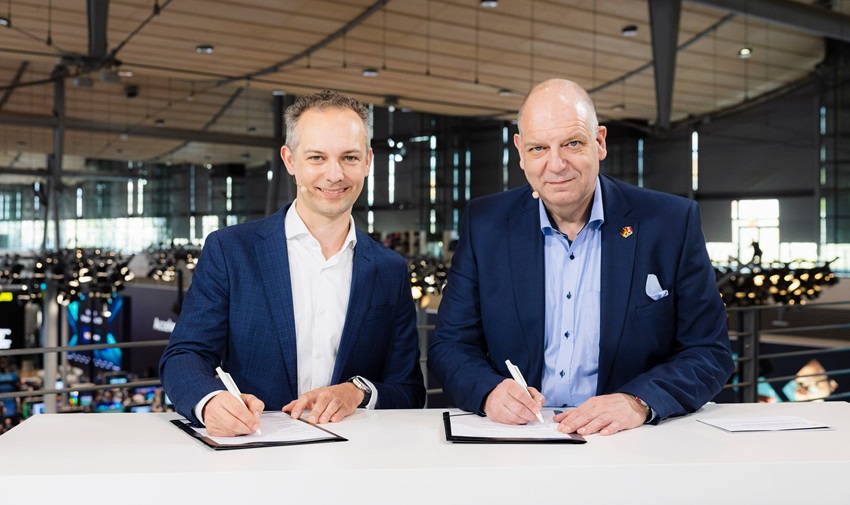 TURN2X의 공동 창립자이자 CTO 도미닉 숄렌버거(Dominik Schollenberger) 박사(왼쪽)와 지멘스 디지털 인더스트리 공정 자동화 부문 CEO악셀 로렌츠(Axel Lorenz)(오른쪽)가 파트너십 계약서에 서명하고 있다.