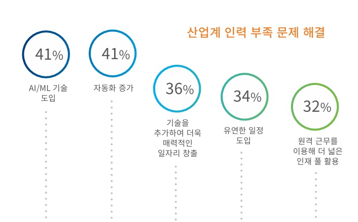 AI 기술은 인력 문제 해결에서도 중요한 역할을 하고 있다. 전체 응답 기업의 48%는 스마트 제조 기술 투자를 통해 기존 인력을 재배치하거나 신규 채용할 계획이라고 밝혔으며, 41%는 AI 및 자동화를 통해 기술 격차 해소 및 인력난 대응에 나설 계획이라고 답했다.