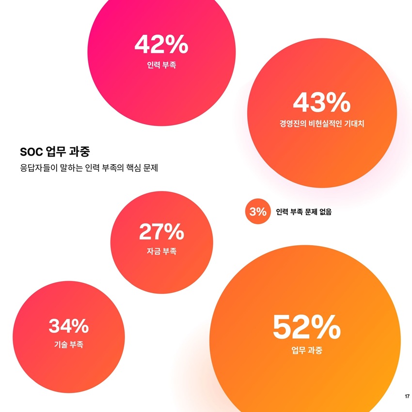 이번 보고서는 운영상의 어려움을 넘어, SOC 분석가들이 받는 극심한 업무 부담을 짚고 있다. 높은 스트레스, 만성적인 인력 부족, 번아웃은 인재 이탈과 팀의 장기적인 안정성에 위협이 되고 있다.