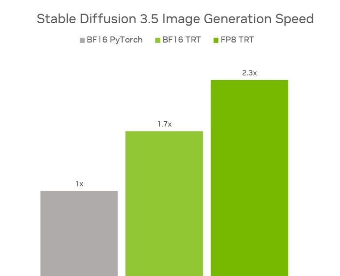 엔비디아는 스태빌리티 AI(Stability AI)와 협력해 최신 모델인 스테이블 디퓨전 3.5 라지를 FP8로 양자화해 VRAM 사용량을 40%까지 줄였다. 여기에 엔비디아 텐서RT(TensorRT) 소프트웨어 개발 키트(SDK)를 통한 최적화로 스테이블 디퓨전 3.5 라지와 미디엄 모델의 성능을 2배로 끌어올렸다.