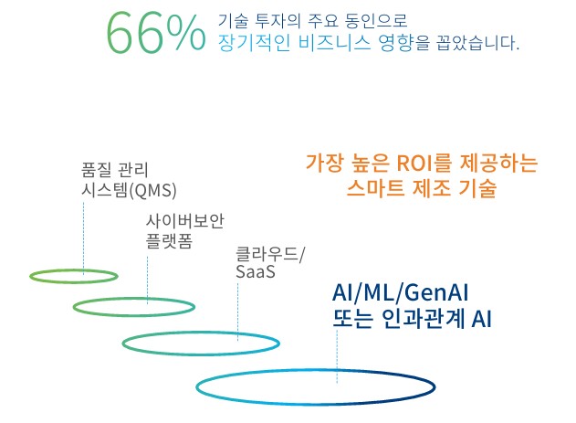 보고서에 따르면 전체 응답자의 95%는 이미 스마트 기술을 도입했거나 평가 중이라고 답했으며, 특히 AI는 품질 개선(53%), 운영 효율화(50%), 사이버보안 강화(48%) 등에서 활발하게 활용되고 있는 것으로 나타났다.
