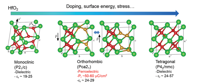단사정계의 HfO2 박막에 도핑, 표면 에너지, 스트레스를 가하면 사방정계 또는 정방정계로 상변화가 일어난다. HfO2의 강유전성은 Pca21 공간군을 갖는 사방정계(orthorhombic phase) 형성에 기인하며, 벌크 상태의 산화하프늄 상평형도에서는 강유전성 결정상이 안정상인 온도나 압력 영역이 존재하지 않는다고 알려져 있다.[8],[9]