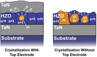 S. S. Fields 등 연구진은 2022년 동일한 TaN 상하부 전극과 HZO 박막을 가지는 커패시터의 열처리 순서를 조정하여 상부 capping 전극이 결정 형성에 미치는 영향을 분석하였다. 상부 전극은 HZO 박막의 결정화 동안 평면 외 확정을 억제하여 m-phase 형성을 방지하고 o-phase의 형성을 유도하며 이에 기인하여 높은 분극 값과 낮은 누설전류를 가질 수 있다 설명하였다. [22]