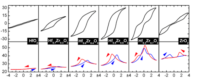 2011년에 발견된 산화하프늄(HfO2)의 강유전성은 이러한 문제를 해결할 수 있는 돌파구가 되었다.[4] Si가 도핑된 HfO2는 10nm의 얇은 두께에서도 높은 자발분극(Pr)을 유지하여 집적도 측면에서 강유전체 소자 연구를 재조명하게 했다.[5] HfO2와 유사한 구조와 특성을 지닌 지르코늄산화물(ZrO2)이 도핑된 HZO(HfZrOx)는 낮은 열처리 온도에서도 강유전성을 발현할 수 있어 주목받고 있다. [6],[7]?