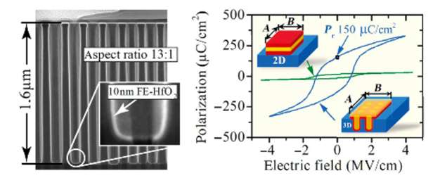 Polakowski 연구팀은 TiN/Al/TiN 기반의 deep-trench capacitor를 제작해 면적당 152 μC/cm²의 Pr 값을 얻었고, 13:1의 aspect ratio를 갖는 deep-trench transistor를 통해 총 잔류 분극 값을 증가시켰다. [15]